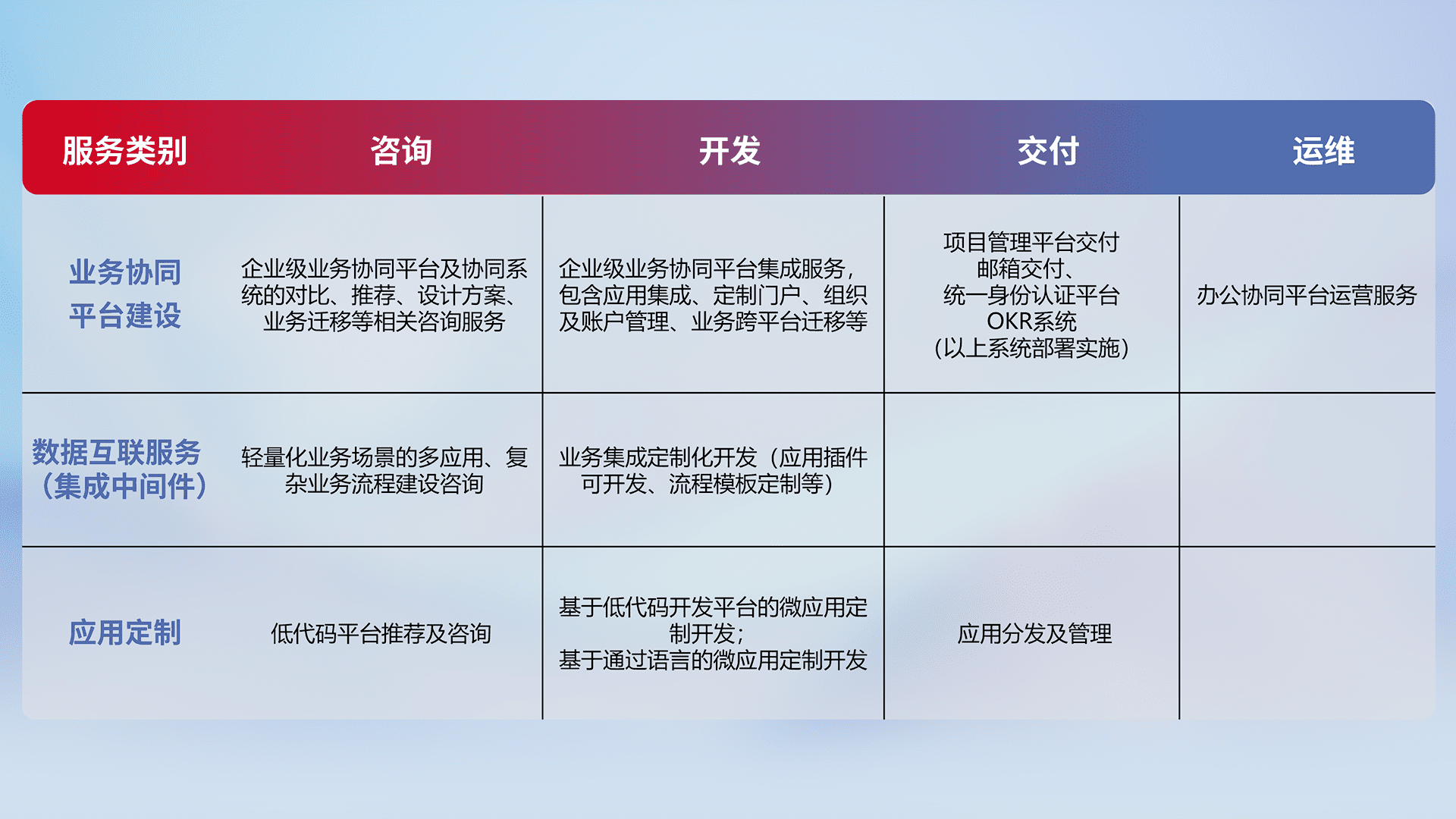 针对钉钉、、企微、、、IDaas等平台级产品提供产品的规划、、、、方案、、、、交付、、定制化开发等服务,,实现如统一协同办公、、、、智能客户服务、、、混合会议管理、、、智能数据查询、、、、等业务场景,,,实现数字化转型。。。