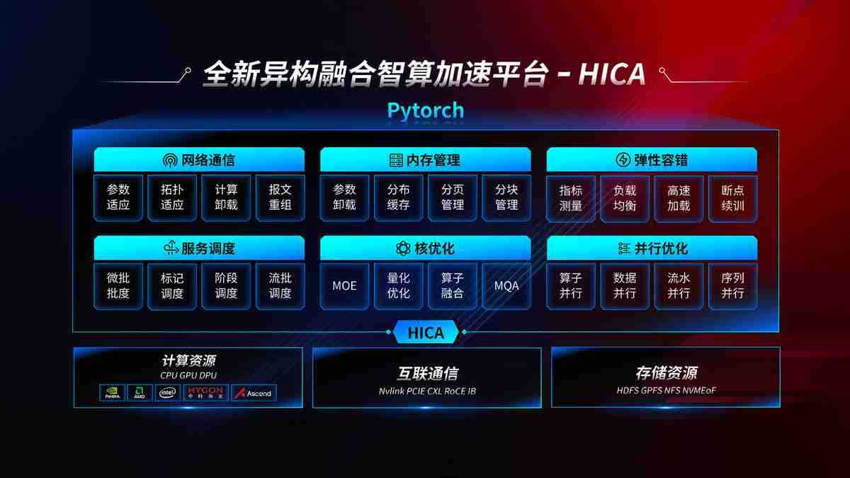 通过自研的服务层、、、、中间适配层、、、、以及调度编排算法,,采用数据并行、、、、模型并行等多种并行方式,,,,把并行计算任务进行有效的分解,,,使其分别由相应的软件栈和算力资源来承接。。当GPU资源变化,,,,HICA可以实时动态调度计算子任务并调整模型拓扑和架构,,以充分聚合各种算力资源。。。